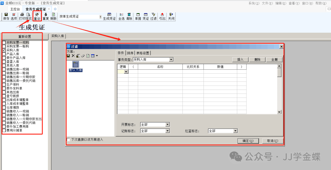 在打开的凭证模板界面,左边选择对应的事务类型,在右边空白处单击,再到左上角点击“新增”,在弹出的新增窗口将凭证模板填完整。需要用到的单据事务类型都要设置对应的模板,系统已经预设好通用模板。 - 凭证生成步骤:进入业务凭证生成界面,左边选择事务类型,点击“重设”,在弹出的过滤窗口中根据情况筛选出单据,勾选单据并选择单据生成凭证的方式然后点击“生成凭证”。
