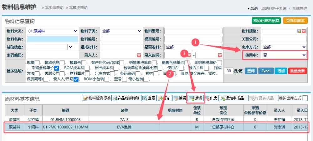 找到需要作废的物料代码,然后点击“作废”按钮,就可以将这个物料代码作废了。 注意,如果这个物料还有进行中的订单、仓库库存等,则禁止作废此物料代码,必须先处理结案完毕所有的订单和仓库库存后,才允许作废此物料代码。 二、物料代码激活重用方法 如果已经作废停用的物料代码想重新恢复使用,那么还是进入ERP系统-》系统管理-》物料管理-》物料信息维护: ![]() 查询条件中,使用中务必选择为“否”,然后查出已经作废的物料代码,点击上面的“激活”按钮,就可以重新将此物料代码投入使用了。 点晴模切ERP更多信息:https://moqie.clicksun.cn,联系电话:4001861886 该文章在 2025/7/11 16:58:07 编辑过 |