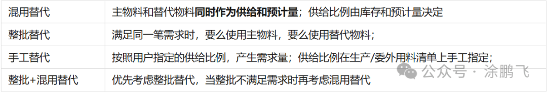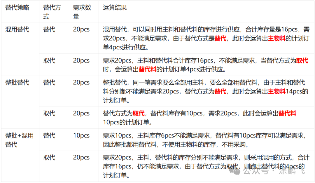 MRP运算后,分析计算结果。 根据本案例,需求数量10pcs,材料1库存6pcs,不能满足需求,由于设置的替代策略是混用替代,所以主料和替代料可以混合使用,需求的10pcs其中的6pcs用材料1供应,剩余4pcs的需求,先查看作为替代主料的替代1的库存是否满足,由于替代1库存有10pcs,可以满足需求,因此不用产生材料1、替代1的计划订单;同时因为替代1和替代2是同时替代材料1,所以替代2的需求数量也是4pcs,库存有8pcs,可以满足需求,不用跑出替代2的计划订单。下图所示。