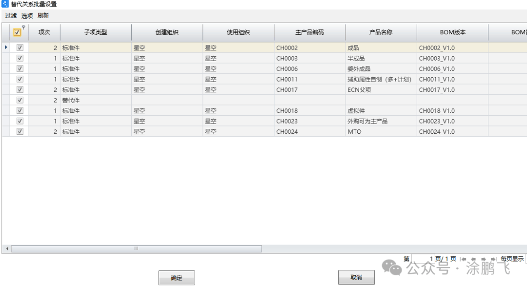 然后在“替代关系批量设置”界面中,勾选需要批量设置的BOM,再点【确定】即可,如下图所示:
