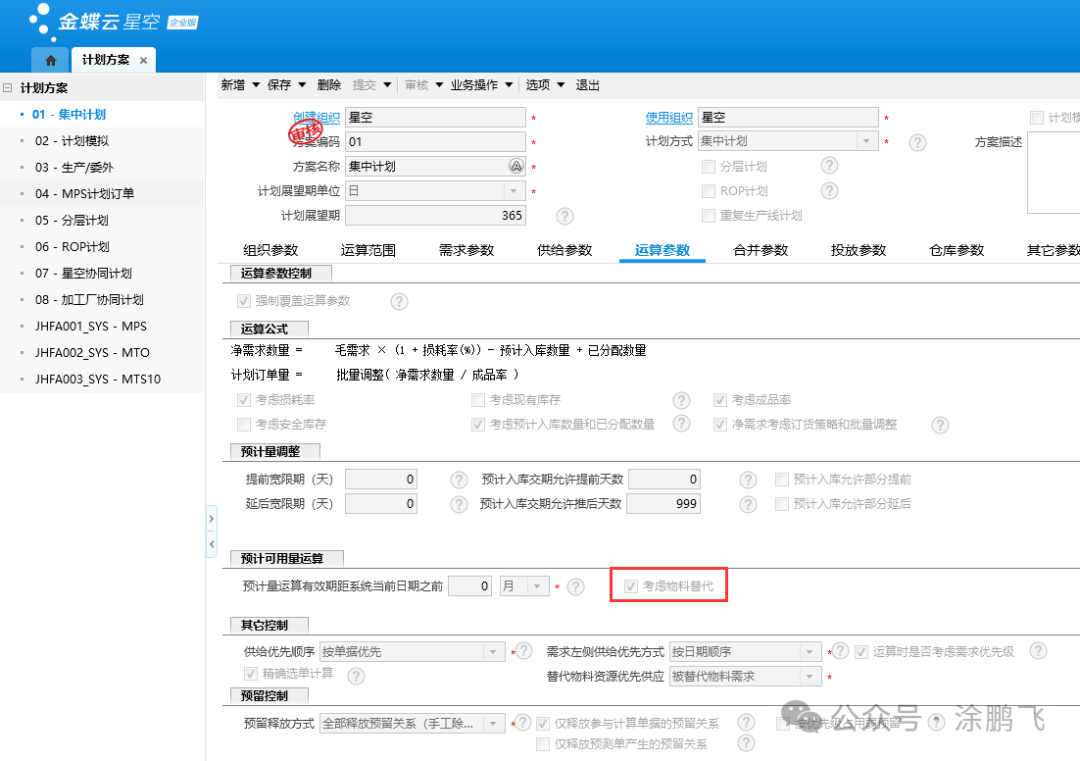 计划方案的【运算参数】页签需勾选“考虑物料替代”