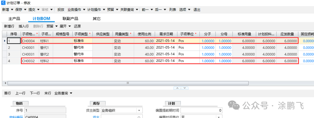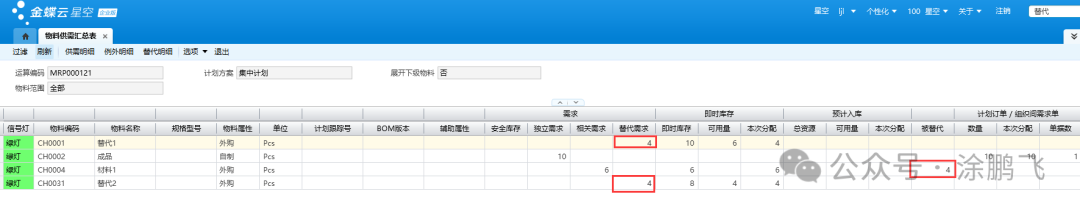 MRP运算后,分析计算结果。 根据本案例,需求10pcs,替代策略为混用替代,作为替代主料的材料1库存有6pcs,因此剩余4pcs的需求要产生替代,作为替代主料的替代1库存有10pcs,可以满足4pcs的需求,所以最终主物料需求6pcs,替代料需求4pcs,由于材料2库存为0pcs,因此需要跑出6pcs的计划订单进行供应。运算后成品的计划BOM如下图所示,其中材料1和材料2的需求是6pcs,替代1和替代2的需求是4pcs。