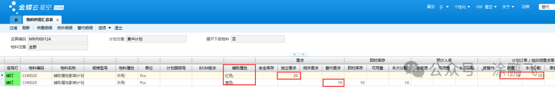 新增销售订单,辅助属性选择红色,需求数量20pcs,在计划方案的运算参数页签勾选“考虑物料替代”,辅助属性是红色的即时库存为0,辅助属性是黄色的即时库存有10pcs。进行计划运算之后,只需再投放10pcs辅助属性是红色的计划订单即可。如下图所示。