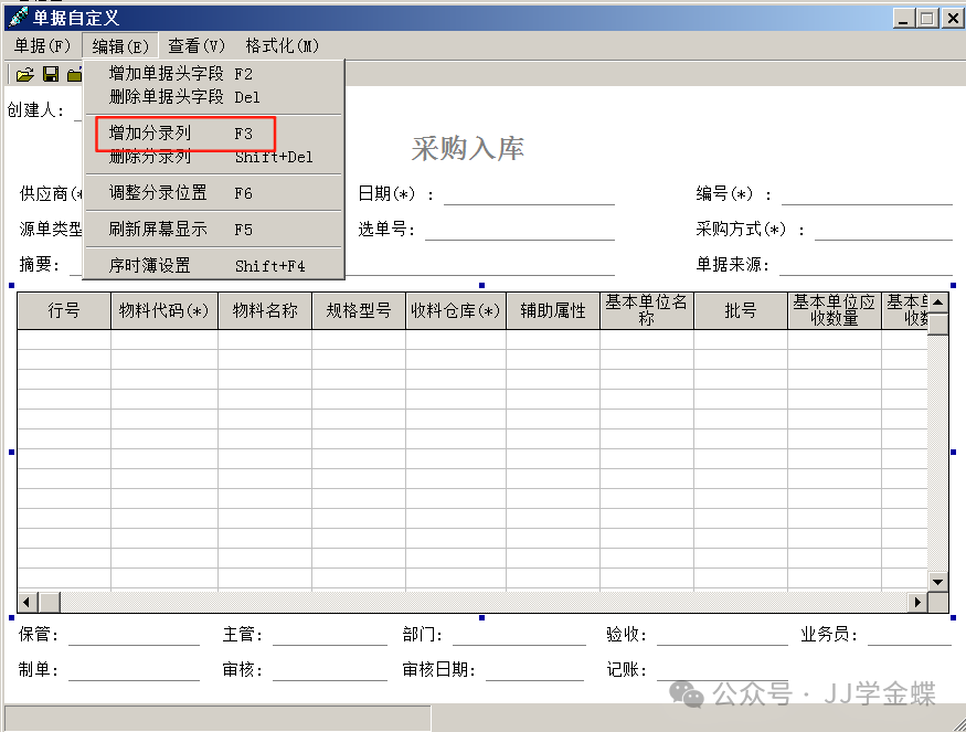 4、在采购入库单表体鼠标右键选择“增加分录列”,或者直接在左上角的工具栏【编辑】里点击“增加分录列”,截图中我们也可以看到按F3也可以实现该功能;