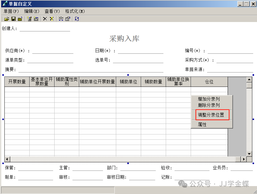 5、接下来我们设置新增分录列的属性(名称及取数来源); a、在采购入库单表体鼠标右键点击“属性”,找到新增的分录列;