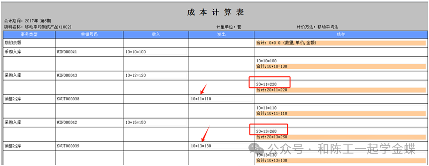 2.移动平均法: 2.1 计算方法:本次出库日期前的结存金额/本次出库日期前的结存数量 2.2 计算结果:6.5号的出库成本:(100+120)/(10+10) =11 6.15号的出库成本:(110+150)/(10+10)=13