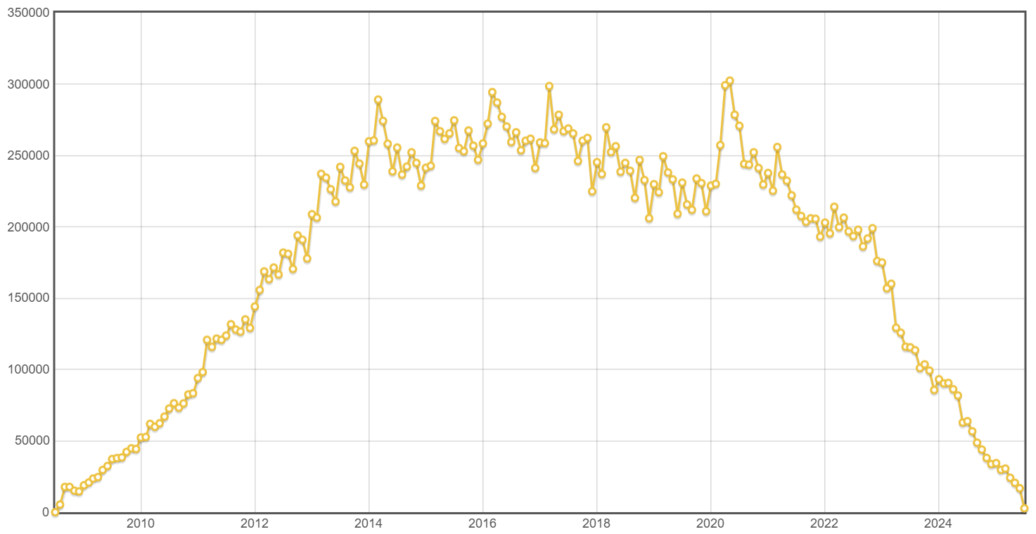 ![]() 它可以以 SQL 的形式查询相关的数据。 从走势图可以看到,从 2008 年到 2014 年是陡增的趋势,可以说是高歌猛进,翻着翻的上涨。 2014 年到 2020 年,数据起起伏伏,但总比 2020 年之后的一泻千里好的多。 把每个月的明细数据下载下来之后,我看了一下 TOP 3 的情况: