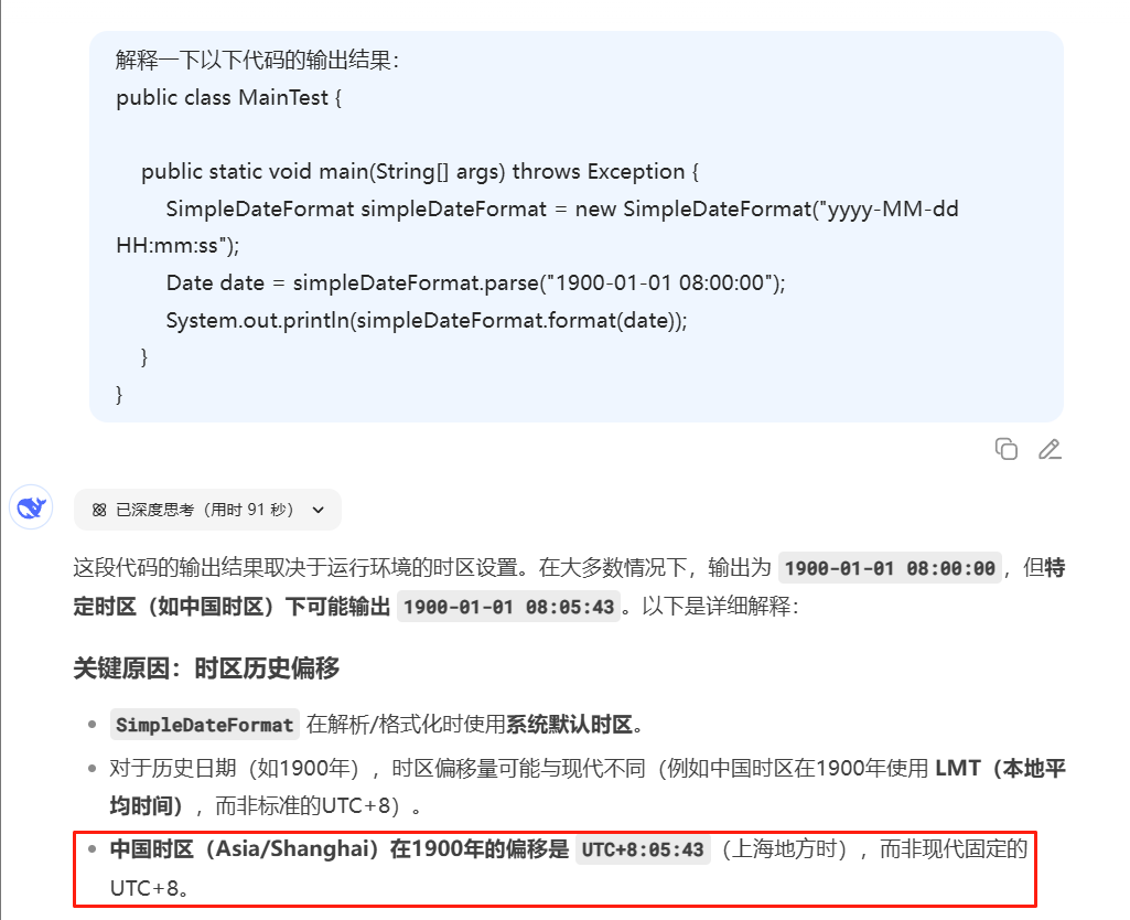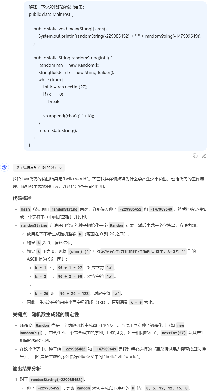 最辉煌的时候,是 2020 年。 可能那个时候大家都在居家办公,遇到问题也没有同事可以咨询,就顺手在网上求助网友了。 但急转直下也是在 2020 年。 因为那一年末 ChatGPT 横空出世,并凭借还算不错的表现,慢慢被大家开始接受了。 而这几年 AI 发展的突飞猛进,越来越少的人选择 stack overflow。 至于为啥越来越少的人选择 Stack Overflow? 我想还是在于便捷性上。 和 AI 交互,你给它问题,它能立马响应,直接给你正确答案,或者引导你去寻找正确答案。 和 Stack Overflow,或者和任何问答平台交互,你发布问题之后得等,等到有人看到你的问题,然后才有可能会回答。 如果你只是想在 Stack Overflow 里面找一个问题的答案,而不是打算自己提出一个问题的话,那 AI 更加是碾压式的存在。 因为你可以让 AI 帮你在 Stack Overflow 里面找答案。 Stack Overflow 免费提供了它十几年间的所有问答数据,然后被各个 AI 当做了训练模型。 最后落得的下场,说好听点叫功成身退,说难听点就是卸磨杀驴。 我记得曾经还有一个关于程序员的梗。 就是当程序捕获到异常之后,由程序自动发起一个请求给 Stack Overflow,然后获取解决方案。 所以,作为程序员,你应该知道 Stack Overflow 在某种程度上,它就是程序员的圣经,它的回答就是权威。 我写技术类文章的时候,如果顺着问题找到一个 Stack Overflow 的链接,我在潜意识里面就会认为,这个链接里面就会有我在寻找的答案,而且是正确答案。 但是这些都是很新鲜的“过去的故事”了。 我把前面获取到的表格排序后拉到表格最后,2025 年的数据已经跌落到了 2008 年的水平: ![]() 再回头看看这个走势图: ![]() 不得不承认,Stack Overflow,几乎是成不可逆转之势般的倒下了。 两个问题。我之前写过的技术文章中,Stack Overflow 出现的频率非常的高。 有时候我会去上面找素材。 以至于一提到 Stack Overflow 我立马就能想起至少两个我写过的有意思的问题。 第一个问题是这样的: ![]() 当时觉得这个输出结果很奇怪,有点意思,于是研究了一下。 最终经过一番折腾也是在 Stack Overflow 找到了答案。 但是现在,我只需要把问题扔给各种 AI 大模型,比如 DeepSeek。 它就能给出答案: ![]() 然后还可以继续追问“额外5分43秒”产生的具体原因是什么: ![]() 给出的参考链接中也有 Stack Overflow 的链接: ![]() 第二个问题是这样的: ![]() 把这个问题扔给 DeepSeek 之后,它也很快就给出了答案: ![]() 答案总结起来就是一句话: 伪随机数生成器的序列是确定的,但看起来“随机”。 这些特定的种子值(-229985452 和 -147909649)是通过反向计算或暴力搜索找到的,目的是使 nextInt(27) 的序列恰好匹配 "hello" 和 "world" 的字符编码。 好,现在如果没有 AI,我给你上面这两段代码。 甚至我直接告诉你,这个代码的输出结果可能是 1900-01-01 08:05:43: 而这个代码的输出结果是 Hello World: 对于这一类初看一脸懵逼,奇奇怪怪的问题,在“面向搜索引擎编程”的时代,让你去探索一下为什么,你是不是多少也得花费一点点功夫。 甚至,完全有可能你花费了一些功夫,没有找到答案,或者找到了一个以为正确,实际错误的答案。 而现在,你只需要扔给 AI,它就会给你分析的明明白白的。 至于它的分析是否合理,你可以进行自己的判断。 至少节约了在网上瞎找链接的过程,而这个过程,按照我个人经验来说,也是非常耗时的。 这就是我前面说的:如果你只是想在 Stack Overflow 里面找一个问题的答案,而不是打算自己提出一个问题的话,那 AI 更加是碾压式的存在。 从这个角度,也能瞥见 Stack Overflow 倒下的必然性。 但是,我还是想说一个但是。 或者说,我更想说的这个“但是”。 但是,当我和 AI 对话的时候,我得到的是一个精准的回答,这当然是我的终极目标。 然而,当一个问题在问答社区被提出之后,有时候也会引发激烈的争论,几方各执一词,隔着屏幕输出着自己的观点。 我这里说的“几方”,指的是来着天南海北,有着不同时区的程序员群体。 而他们的争论,往往会给一个问题增加故事性。 AI 不一样,AI 给出的回答就是绕过了一切的回答,跳过了中间的争论,也跳过了中间的故事。 它把最重要的知识提取出来,然后扔掉了背后的故事。 最后,知识还在,但故事死了。 AI 怎么说最后,我问了 DeepSeek 一个问题: