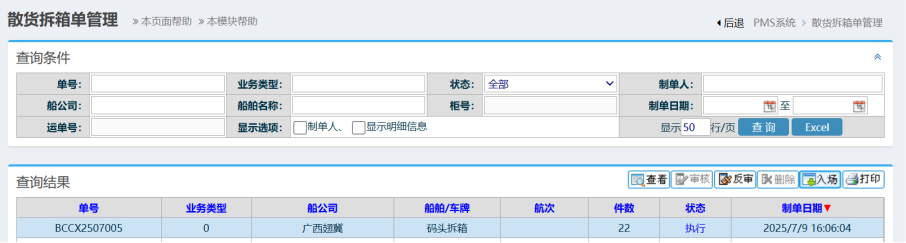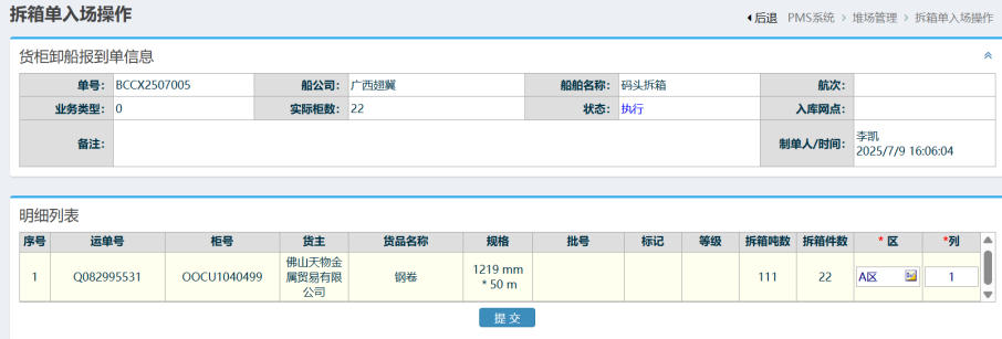 :点晴PMS-拆箱单入场确认-操作流程![]() 1. 进入菜单拆箱单管理: 如下图所示 2. 进入界面后,选择对应的单据,点击入场按钮, 如下图所示: 3. 进入界面后,核对清单,选中对应的区和列,点击“提交”按钮完成, 如下图所示 ![]() 点晴模切ERP更多信息:https://moqie.clicksun.cn,联系电话:4001861886 该文章在 2025/7/15 16:10:00 编辑过 |