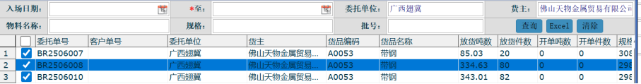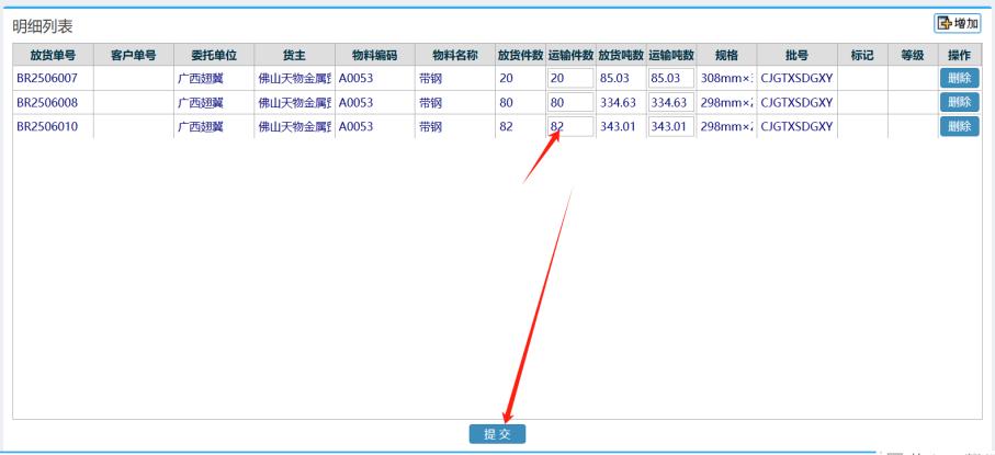 3. 点击增加后,勾选对应的清单,核对相关运输件数,点击提交按钮完成 如下图所示: