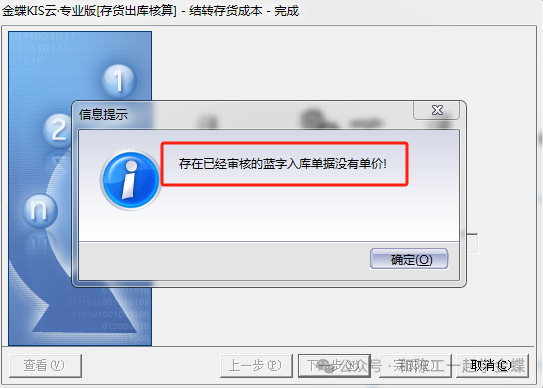 有很多客户一到月底成本核算时就头痛,存货出库核算经常提示错误,成本计算表里面一大堆结转失败,红红的看着就头大,到底是什么原因呢? ![]() 今天给大家说道说道 首先存货出库核算的原理:按照成本计价方法,根据期初结存及本期入库的单价计算出本月出库的成本单价,当入库没有单价,或者负库存出库时,或者红字领料时,那么就相当于入库没有单价,出库的成本单价就会是0或者错误的成本单价,那具体有哪些情况呢? 1. 有未审核的库存单据,在期末结账,结账前检查里面,本期未审核的库存单据,查看明细,就会看到当月未审核的单据,因为月底结账前会审核这些单据,所以之前已经核算过的存货出库核算就会有问题,所以存货出库核算的前提就是所有的单据都已经审核 ![]() 2. 存货出库核算过程中,弹出本期有已审核的蓝字入库单据(包括所有采购入库,产品入库,盘盈入库,其它入库,委外入库)没有单价 ![]() 因为存货核算是对入库的单据进行加权平均或者先进先出,入库没有单价,那么出库单价就是错的,比如入库两次,第一次10个单价8800元,金额88000,第二次入库还是10个,没有填单价金额,那现在出库10个,成本单价又是多少呢?成本核算是成功还是失败的