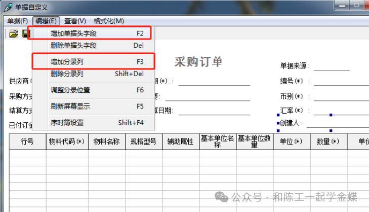 左上角编辑下面有增加单据头字段和增加分录列 单据头字段:指表头和表尾 增加分录列:指表格框里面的内容