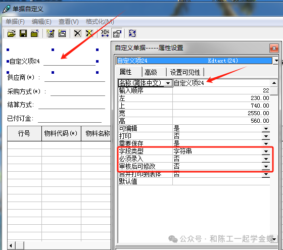 1 属性: 名称:设置该字段的名称 字段类型:可以设置是字符串,单价,数量,金额,还是日期格式 必须录入:如果设置是,那么新增单据时必须录入,不然单据保存不了 审核后可修改:意思就是就算是单据审核后,也是可以直接修改的,不需要反审核单据 需要合计:主要针对分录列增加的金额类字段,对所有分录进行一个合计