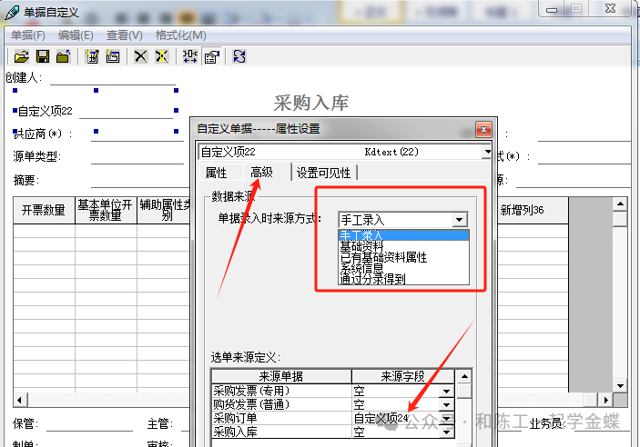 2.6 来源单据:比如刚才采购订单设置了自定义字段24后,在采购入库单就可以设置自定义字段取数来源于采购订单的自定义字段24的内容,这样采购入库就与采购订单一一关联对应了
