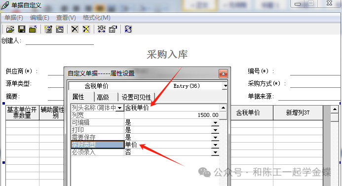 上面讲了那么多,大家应该基本上熟悉了吧,那现在举几个简单的例子 举个简单的例子:有些客户需要在采购入库单上体现含税单价和含税金额 那我们可以在采购入库单上做两个自定义字段,一个是含税单价,另一个是含税金额 含税单价:增加分录列,名称填含税单价,字段类型选择单价,录入来源选择手工录入,选单来源选择采购订单上的含税单价