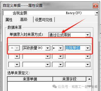 含税金额:名称修改为含税金额,字段类型选择金额,需要合计选择是,高级里面单据录入时来源选择通过公式得到,设置含税金额=实收数量*含税单价