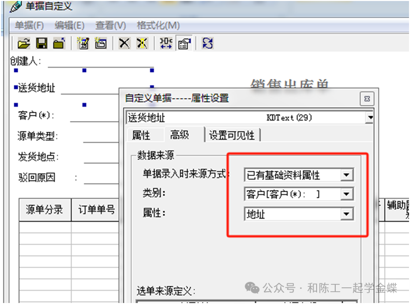 再举个例子:销售出库单上要体现客户的地址,新增单据头字体,名称设置地址,字段类型选择字符串,高级里面,单据录入来源方式已有基础资料属性,类别客户,属性地址,这样就会取基础资料中客户资料里面的地址