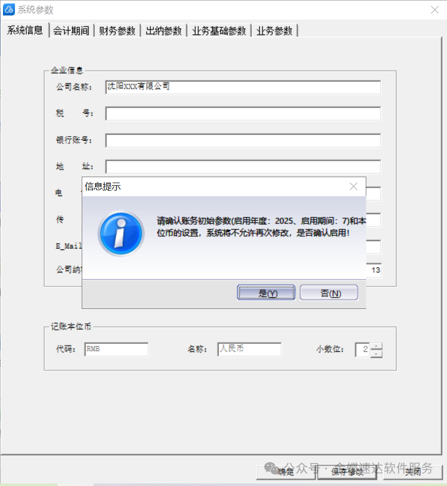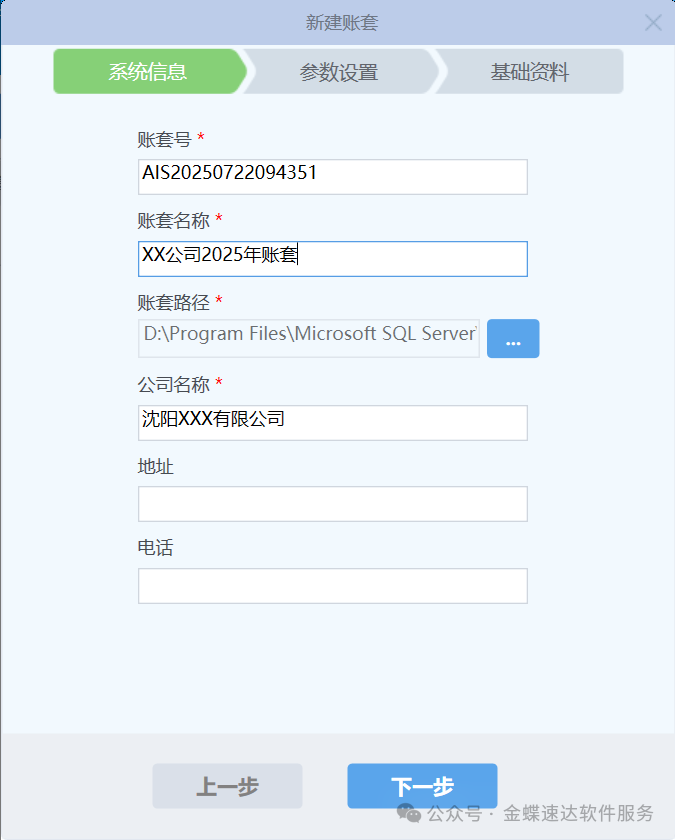 2. 【系统信息】下填写以下信息: 账套名称:建议使用公司简称(如:XX公司2025年账套); 数据库路径:选择非系统盘(如D盘)存储账套数据; 公司名称:填写全称(用于报表打印); 完成后点击【下一步】