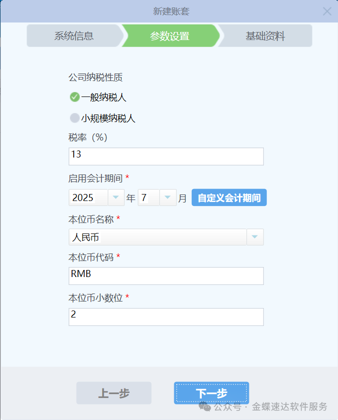 3、【参数设置】下填写以下信息: 公司纳税性质:根据公司实际的纳税性质填写; 税率:根据公司实际的税率填写; 启用会计期间:准备启用软件的会计期间,; 本位币名称:默认人民币,支持下拉选择其他预置币别(如美元、港币); 本位币代码:本位币代码默认与币别对应; 本位币小数位:系统内所有涉及金额的计算和显示将统一采用设置的小数位,一般默认2位; 完成后点击【下一步】 完成后点击【开始建账】 阅读原文:原文链接 点晴模切ERP更多信息:https://moqie.clicksun.cn,联系电话:4001861886 该文章在 2025/7/29 12:26:22 编辑过 |