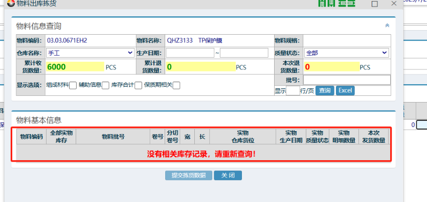 :点晴ERP-新增采购退货注意事项说明![]() 情况描述:采购退货时,查不到相关库存 如下图: