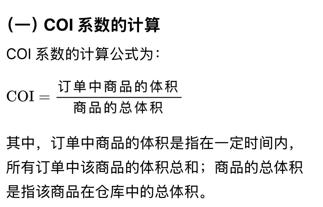 (二)基于 COI 系数的库位分配 根据 COI 系数的大小,可以将货物分为高、中、低三个等级。高 COI 系数的货物通常被频繁订购,应存放在靠近出口或易于访问的位置,以便快速分拣和配送。中 COI 系数的货物可以存放在中间区域,而低 COI 系数的货物则可以存放在较远的位置。 例如,在一个电商配送中心,通过分析历史订单数据,发现某款热门电子产品(如智能手机)的 COI 系数较高。因此,该产品被优先存放在靠近发货区的货架上,以便快速响应订单。而对于一些低 COI 系数的商品(如季节性商品),则可以存放在仓库的较远区域,以节省空间。 基于 COI 系数的库位分配方法能够有效优化货物的存储布局,提升仓储作业的整体效率。以下是该方法的进一步阐述及其在实际应用中的优势和实施步骤。 (三)基于 COI 系数的库位分配方法的优势 1. 优化存储布局:通过将高频次订单商品放置在易于存取的位置,减少了拣货员的行走距离,从而显著提高了拣货效率。 2. 降低仓储成本:合理利用仓储空间,避免了因货物存放不合理导致的空间浪费,降低了仓储成本。 3. 提高库存周转率:高 COI 系数的商品通常具有较高的库存周转率,将其放置在靠近出口的位置,可以加快货物的周转速度,减少库存积压。 4. 增强客户满意度:快速响应订单需求,缩短配送时间,从而提高客户的满意度和忠诚度。 (四)基于 COI 系数的库位分配实施步骤 1. 数据收集与分析 • 收集历史订单数据,包括订单中每种商品的订购频率、订购数量以及商品的体积等信息。