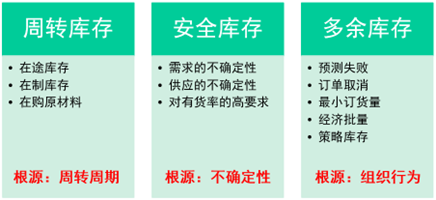 企业的资源不是无限的,所以降库存是不可避免的。但在降库存的方式上,很多企业采取的是“搞运动”的方式,没法触及根源,屡降屡升,屡升屡降。 比如现金流紧张的时候,老总就全民动员,开展降库存运动。于是,销售软硬兼施,拼命把货往渠道压;采购告诉供应商,勒令它们少发货;生产线上也在勒紧腰带,把那些过程库存消化掉。但是,降库存运动一过,库存一点点又上来了:销售渠道库存积压,就不再进新货,公司的成品库存就上升;生产线要正常运作,整条线上的过程库存总得加满;供应商也不能一直压着货,要送货领钱养家糊口,原料的库存就上升了。 库存反弹,就如减肥失败:忍饥挨饿,好不容易减掉几斤,但如果生活习惯不变,一旦转入正常生活,减掉的不但又增加上了,而且增加更多。于是,老总就开始下一轮的降库存运动。结果你知道的:库存就这么越降越多,越多越降。老总在解决库存问题上屡战屡败,最后把库存降成“打不死的妖怪”,就是因为没有找到根源,自然就没法系统地解决问题。 那么,库存的根源是什么呢?库存可分三大部分,其根源也不尽相同,如图 1。 第一部分是周转库存,即维持正常运转的库存,比如从供应商到公司的生产线到销售渠道,总得维持一定的库存量。这部分库存的根源是周转周期。比如生产周期是4个星期,那就意味着有4个星期的在制库存;运输过程是2周,那注定就有两周的在途库存。而要降低周转库存,必须要缩短周转周期。在再订货点的公式里,周转库存就是补货周期内的平均需求,补货周期就是周转周期。 第二部分库存是安全库存,用来应对不确定因素,比如需求波动、补货延误、质量问题等。安全库存的根源是不确定性,只有降低不确定性,才能从根本上降低安全库存。产品的标准化设计增加了规模效益,规模效益带来需求的聚合效应,都降低了需求的不确定性;提高供应商的按时交货率,降低了供应端的不确定性;销售与运营协调通畅,信息更对称,需求的不确定性也会降低。这些都是降低安全库存的有效举措。