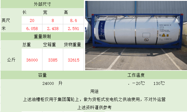 照片名称:20'ISO TANK(罐式集装箱) 备注:这种集装箱是专为装运液体货物,如酒类、汽油、化学品而设计的