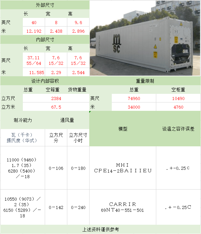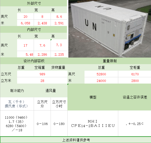 照片名称:20'Refrigerated(冷冻柜) 备注:专为运输如鱼、肉、新鲜水果、蔬菜等食品而特殊设计的