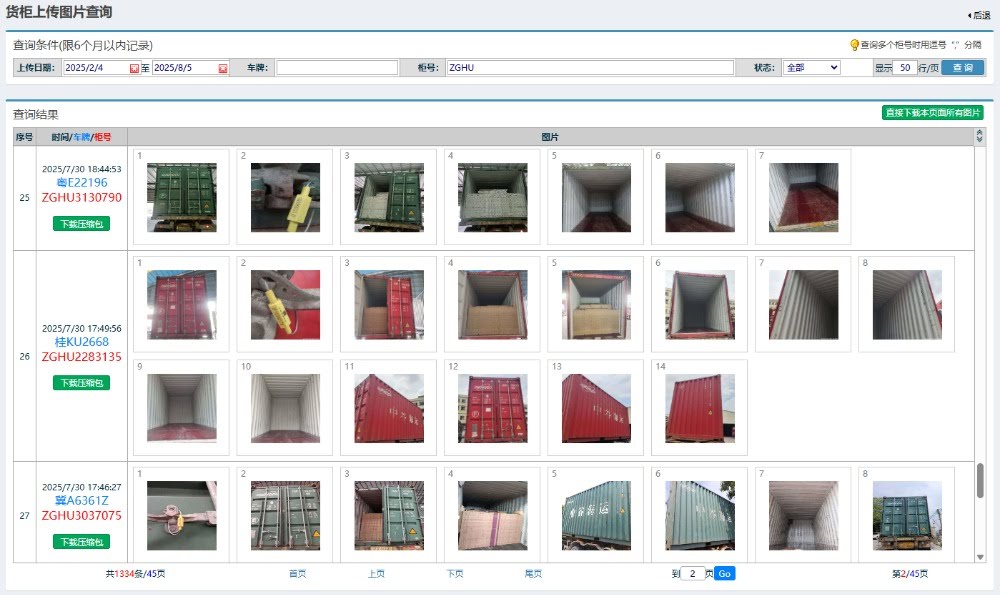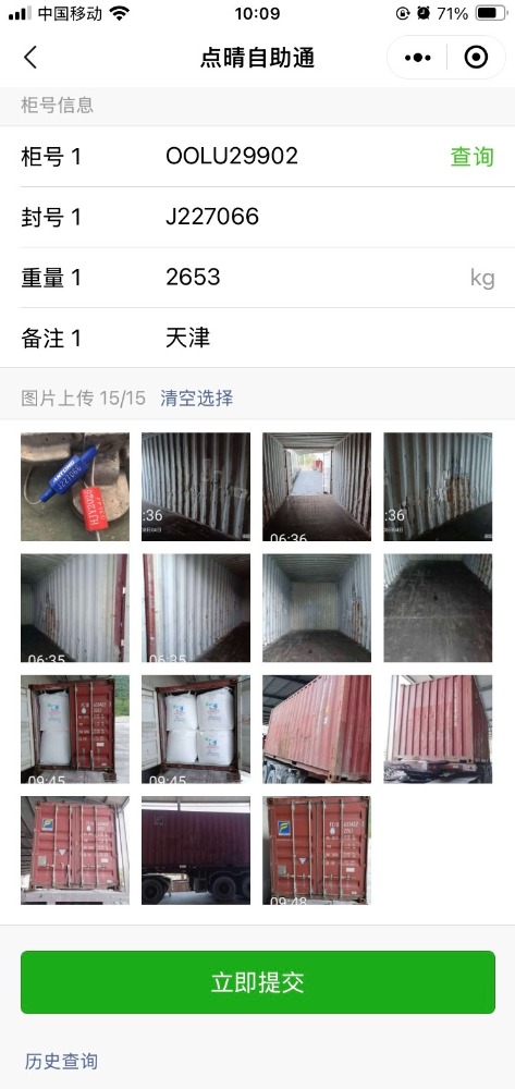 以上全部需留底,直至集装箱到目的地后交回码头。 如果采用点晴集装箱装柜拍照上传小程序(介绍网址:http://www.hgtp.cn),那么拍照完毕后就可以立即通过微信小程序上传到服务器,之后货主或承运商等相关人员可以立即在网上登录到点晴货柜图片管理平台查询到相应的集装箱装柜图片,支持直接图片下载、图片rar压缩打包下载、图片组按照指定格式生成PDF文件下载等,公共查询网址:http://hgcx.oa22.cn。