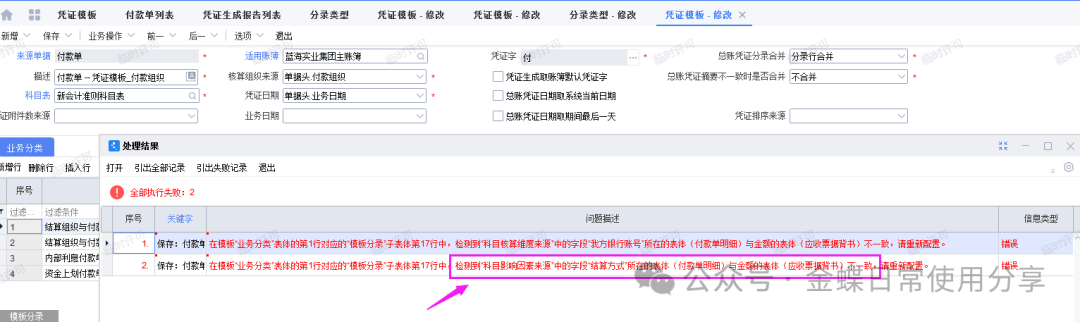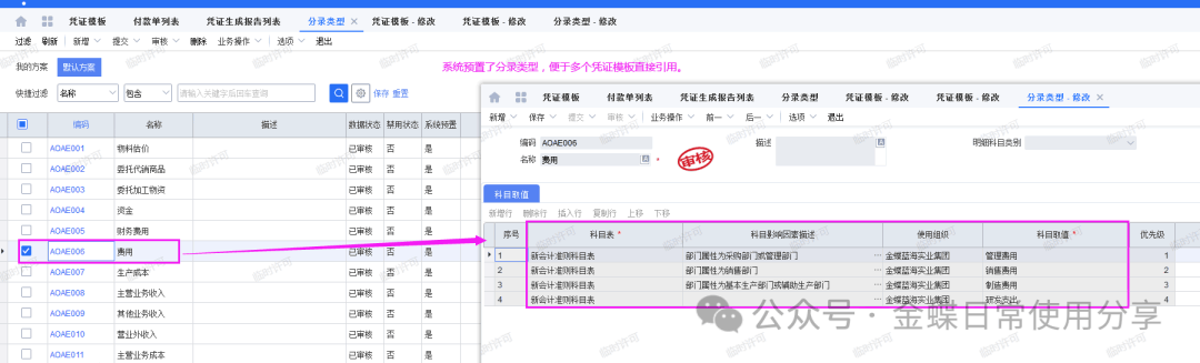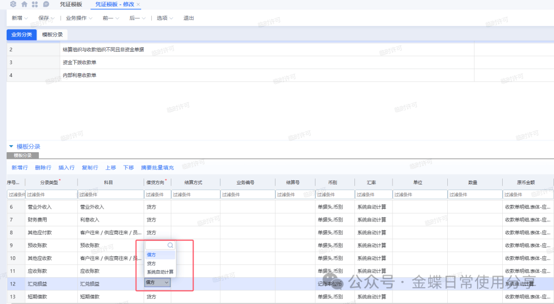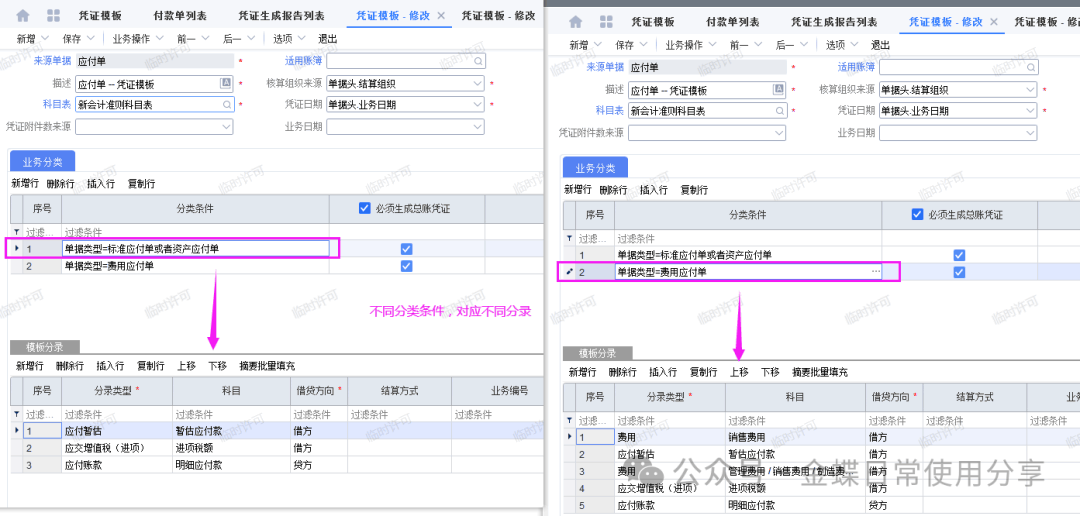 2、业务分类 ① 可以理解为对单据的业务细分,不同的业务分类可以设置不同的模板分录。单据上的表头字段均可以作为业务分类的判断依据(注意不仅仅是单据类型字段)。通过业务分类,可以覆盖一种来源单据承载的多种应用场景。 ② 举例说明:应付单有两个单据类型——标准应付和费用应付,两种单据类型账务处理不同,那么在设置凭证模板时应该设置两个业务分类,一个业务分类的单据类型=标准应付,一个业务分类的单据类型=费用应付,两个业务分类所对应的模板分录是不同的。单据生成凭证时系统会自动判断满足哪个业务分类从而生成对应的分录。
