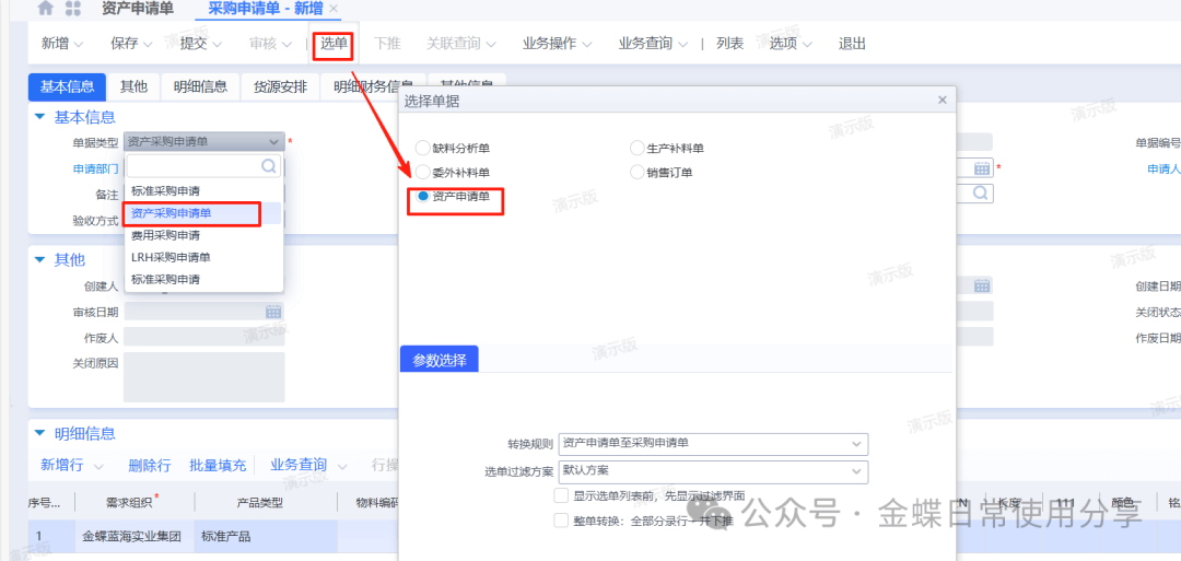 若需求人员不做资产申请单,可以直接创建采购申请单来达到申请的需要,单据类型为资产采购申请单,手动填写资产申请组织及部门、采购组织、物料、数量、到货日期、及建议供应商(可选)并提交审核。