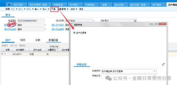 如果资产调出后需要处理,通过资产调出单下推资产处置单。