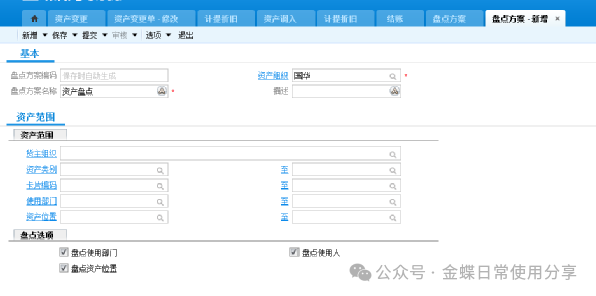 3.6固定资产盘点【业务场景】:企业用户对固定资产进行盘点 【用户角色】:管理会计 【功能菜单】:【资产管理】->【固定资产】->【资产盘点】->【盘点方案】 【操作说明】:选择资产组织、填写名称、设置本次盘点范围及盘点选项,并提交审核。盘点整个资产组织的资产,则不设置盘点范围,只盘点个别范围内的资产,则选择盘点范围。