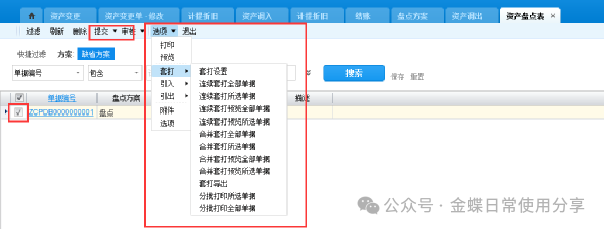 系统生成盘点表 选中需要盘点的盘点表,在选项中,点击套打,选中连续套打所选单据进行套打