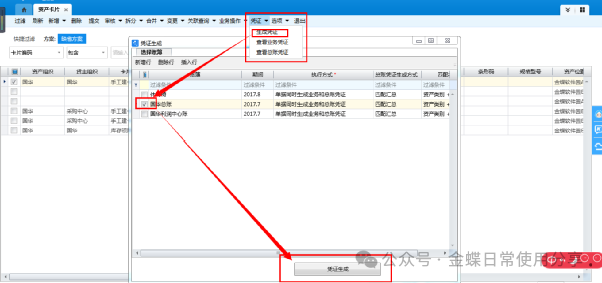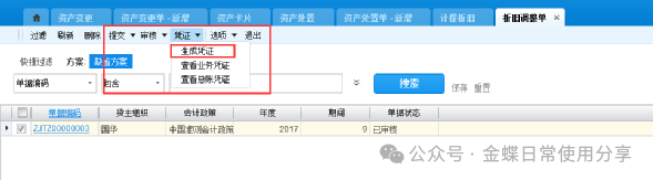选择需要生成凭证的单据,点击“生成凭证”,生成计提折旧凭证,还可以通过列表中查询单据的业务凭证及总账凭证。 生成资产卡片凭证