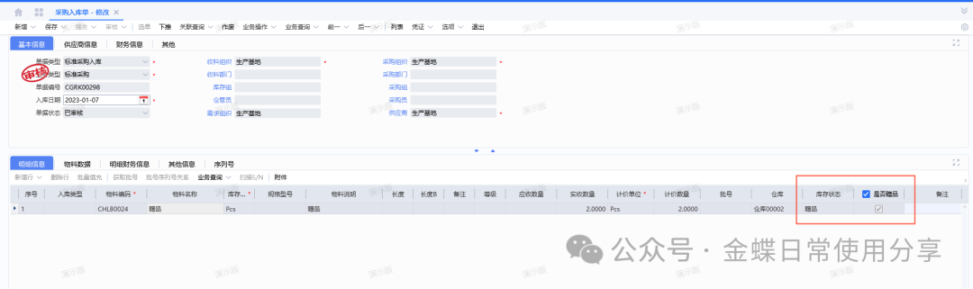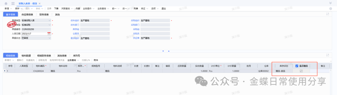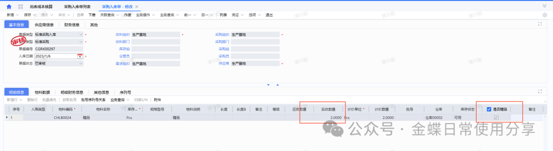 赠品单据生成凭证时,单据明细行存在部分正常采购物料,部分赠品的情况下,勾选成本管理系统参数勾选【赠品、不良品、废品单据成本为零时允许结账】,即可正常生成凭证。 场景2:物料入库只有赠品采购零成本入库,但该物料后续可能是赠品出库,也可能是正常出库业务: 采购入库如下: