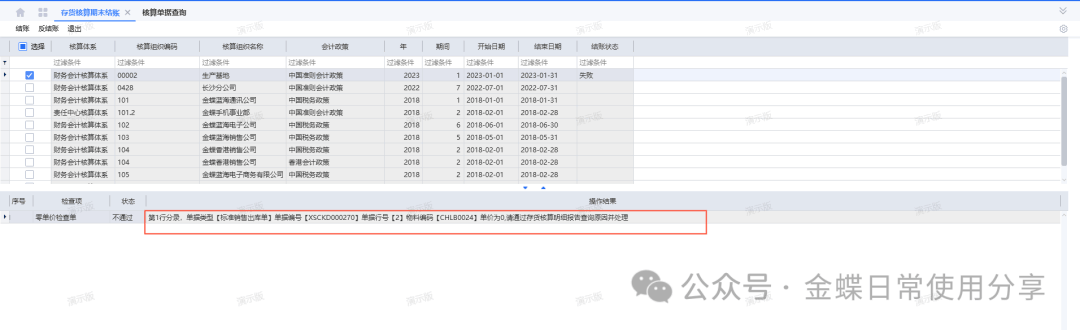 此时,成本管理系统参数仅勾选【赠品、不良品、废品单据成本为零时允许结账】,销售出库单存在第1行勾选赠品出库,第2行正常出库两种情况,该参数无法控制第2行正常出库的情况,存货结账就会提示单据零成本问题: