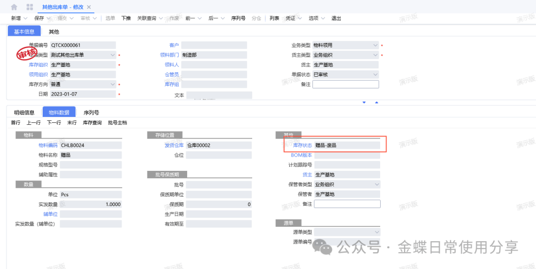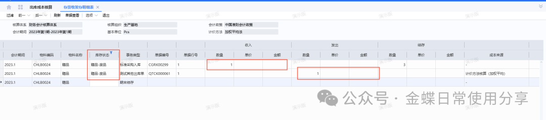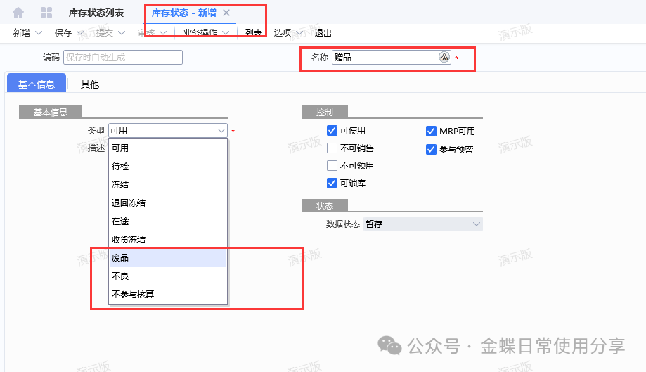 场景3:若该物料只有赠品入库,存在赠品出库或正常出库的两种情况,出库成本需为0,但不想勾选参数【期末存在零成本允许结账】,也有其他的解决方案: 例如设置单独的库存状态,使用废品或者不良这两种系统预设状态,或者自定义赠品类型为不良/废品/不参与核算的库存状态单独处理赠品业务,如下图: