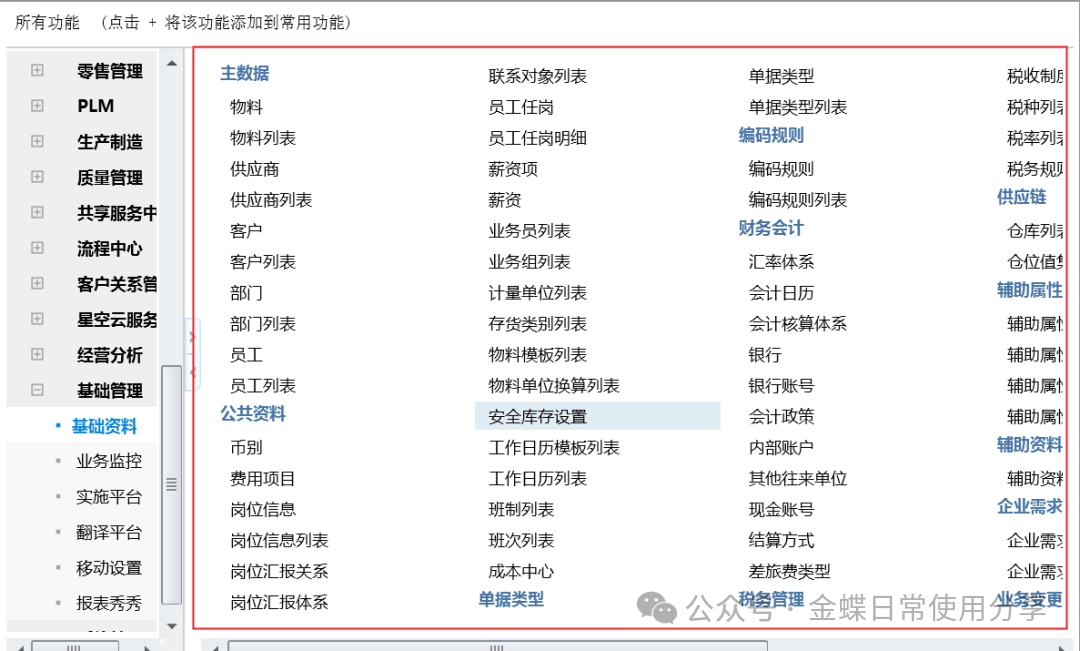 2基础设置2.1设置公用基础资料【业务场景】:系统前期基础数据设置 【用户角色】:总账会计 【功能菜单】:【基础管理】->【基础资料】->【财务会计】 【操作说明】:包括:会计政策、会计核算体系、币别、汇率体系、会计日历、会计要素、核算维度、科目、凭证字、账簿、摘要库、结算方式、现金流量项目等,该部分公用基础资料的设置可参考总账初始化指南。