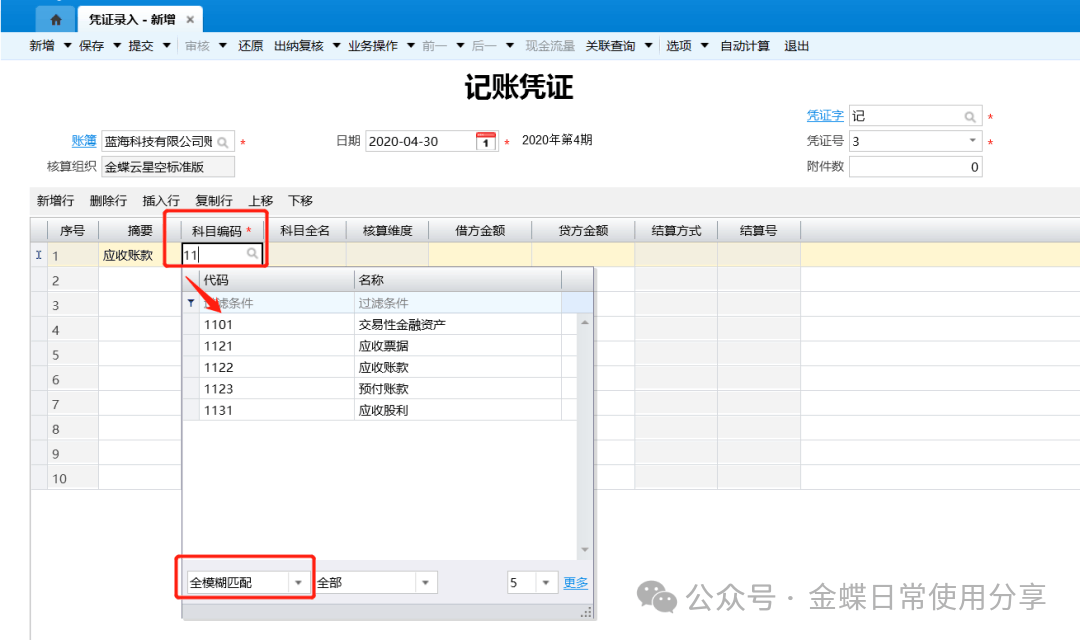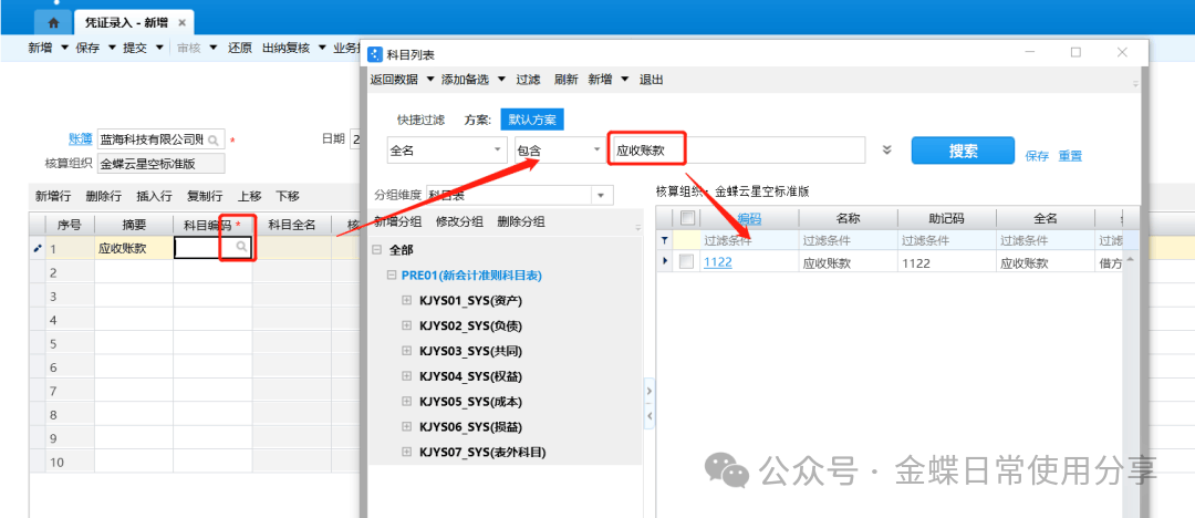 2.手工输入科目编码(系统提供了模糊查询功能),或者通过“放大镜”选择相应的科目编码(系统也支持通过过滤条件快速查找),科目编码录入后自动带出科目全名;