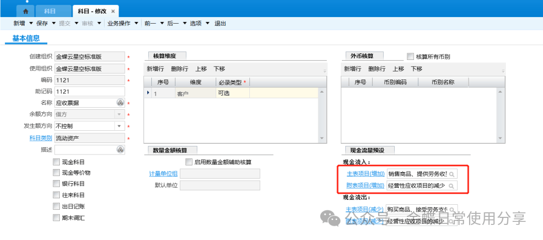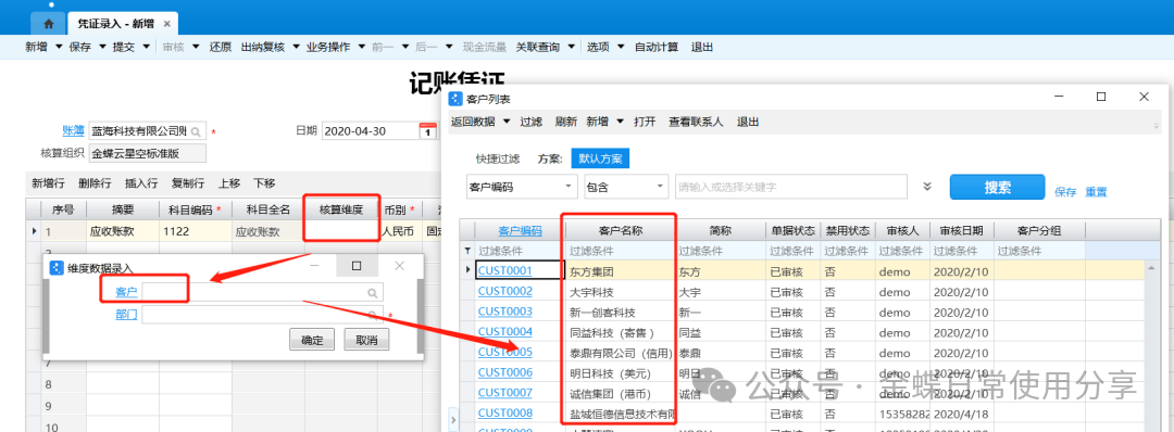 3.如果科目设置了核算维度,还需选择对应的核算维度,比如:应收账款挂了客户这个核算维度,则需要选择对应客户;