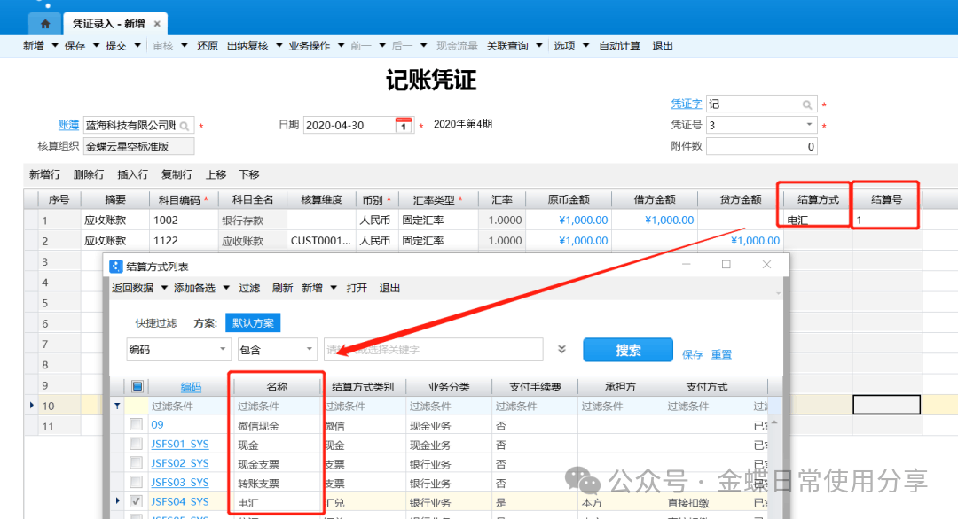 5.根据需要录入银行存款科目的结算方式和结算单据的号码;