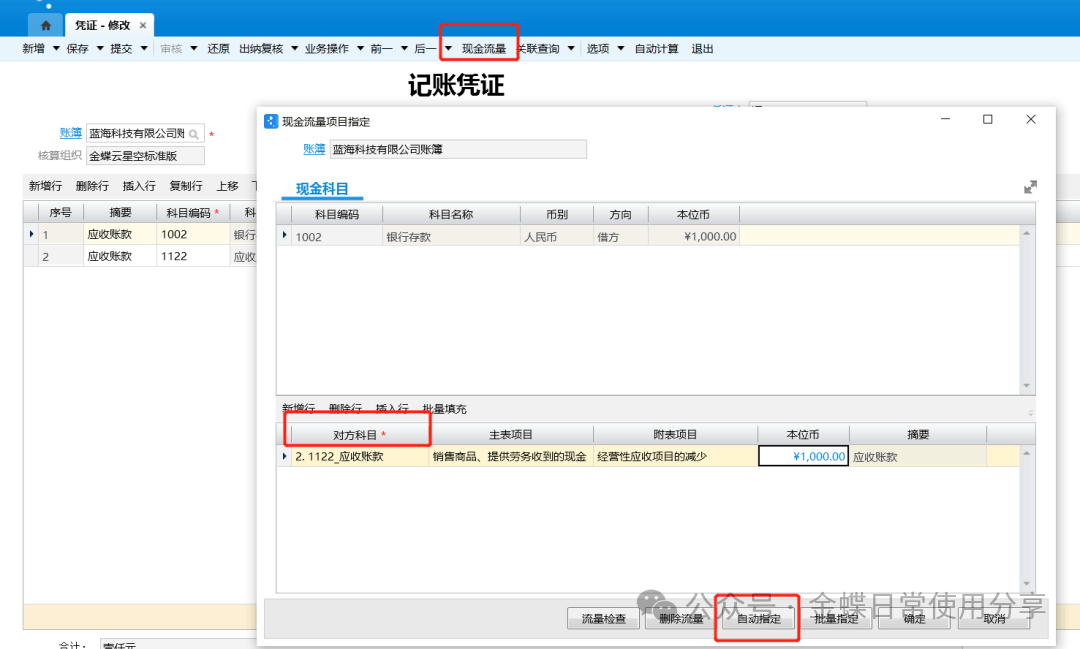 6.点击【现金流量】,在弹出的【现金流量项目指定】框中点击【自动指定】按钮,系统会根据凭证分录的业务分类自动拆分并匹配现金流量科目以及其对方科目,用户也可手工调整;(如果某个会计科目的现金流量项目相对固定,建议在科目中预设其现金流量项目,这样在凭证指定流量项目时,系统可以根据科目预设信息默认携带对应的现金流量项目到现金流量指定界面中,无需再手工选择,参照现金流量相关处理);指定成功后,凭证会红字显示“已指定现金流量”