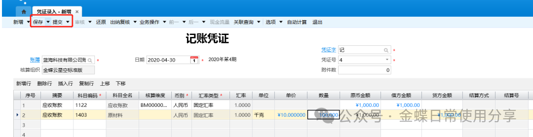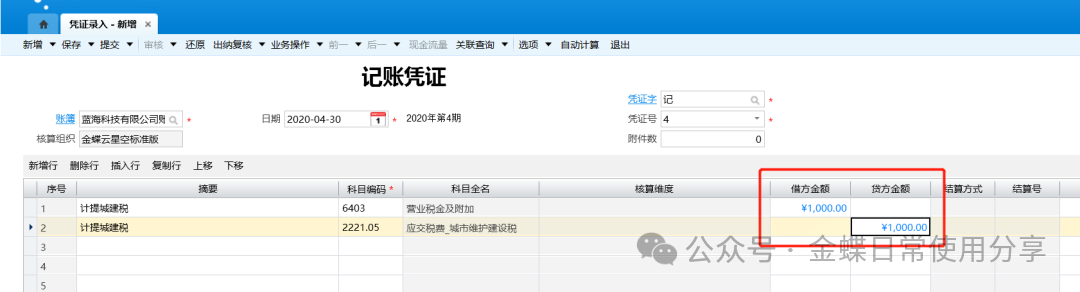 3.录入借贷方金额等,完善此凭证信息,再点击【保存】、【提交】、【审核】按钮;