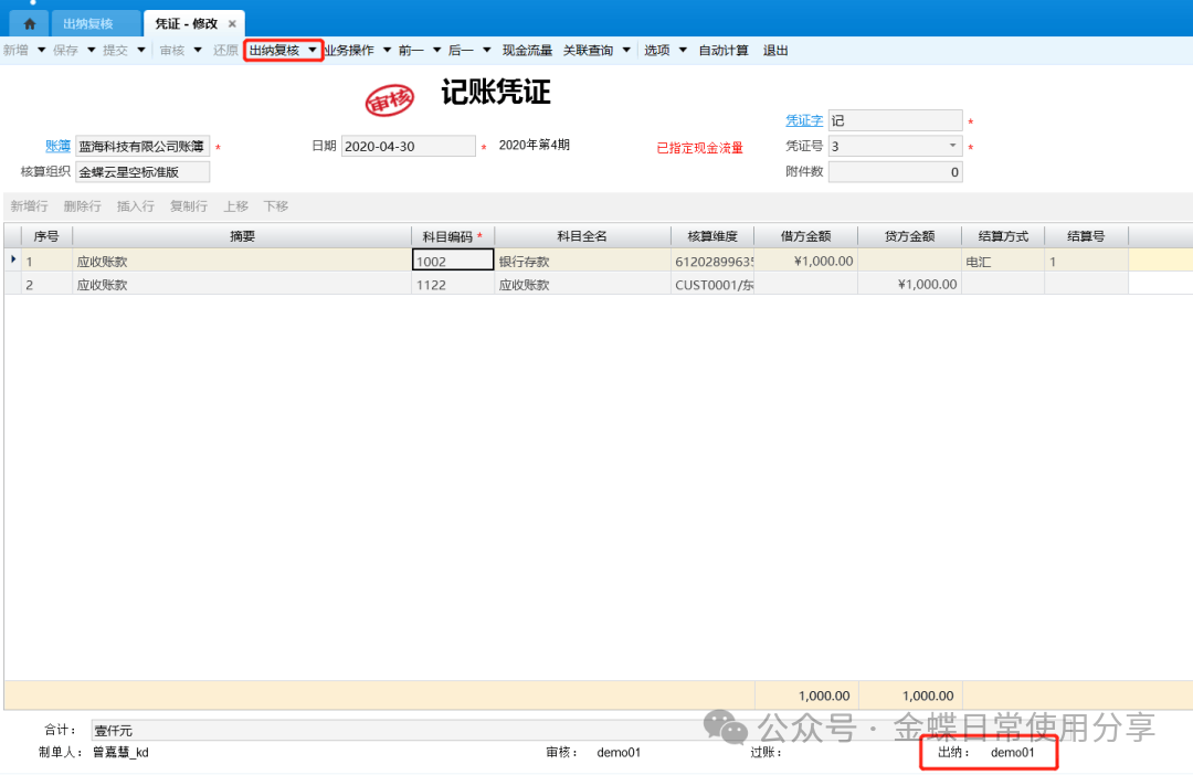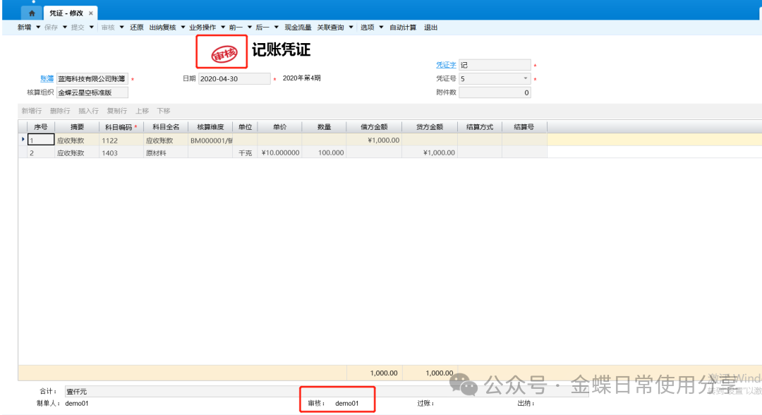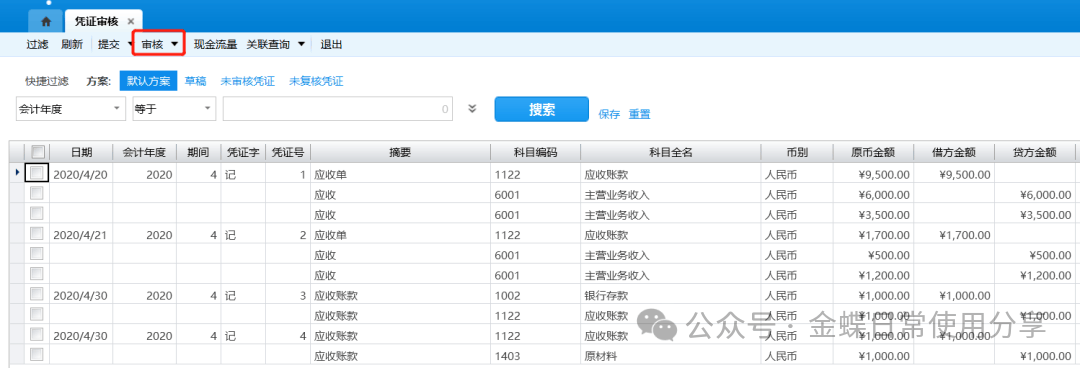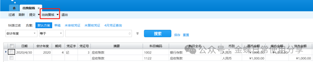 2.待审核凭证通过系统检查审核后,系统自动在凭证的“审核”处签上当前操作用户的名称;