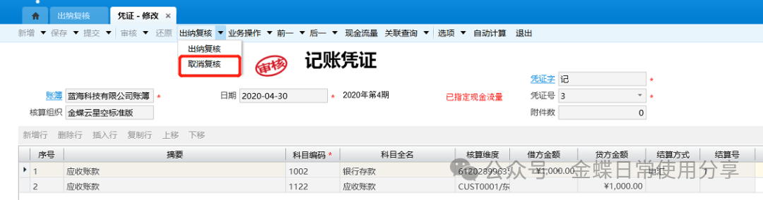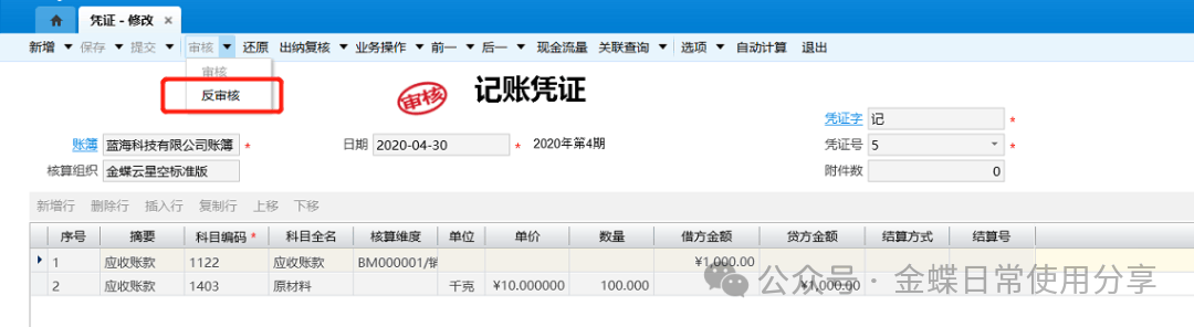 3.用户要修改审核后的记账凭证,点击工具栏的【反审核】按钮,待反审核凭证通过系统检查后则取消审核,同时系统取消凭证的审核签章,凭证状态为“重新审核”状态,此时用户可以修改凭证信息,修改完成后再提交审核凭证;