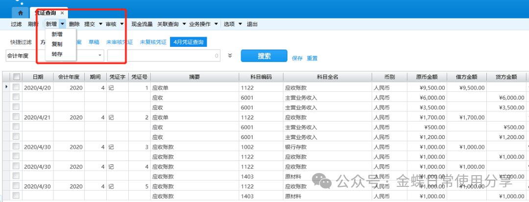 2.用户可以对凭证进行新增、复制、修改以及删除、转存等多个操作,以转存操作为例;