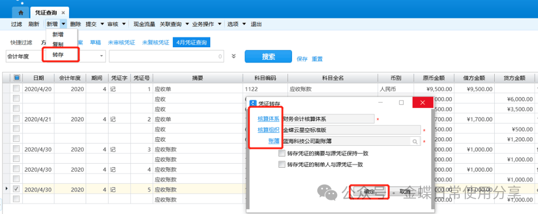 在新增操作中选择“转存”,在凭证转存界面中选择需要转存的账簿;
