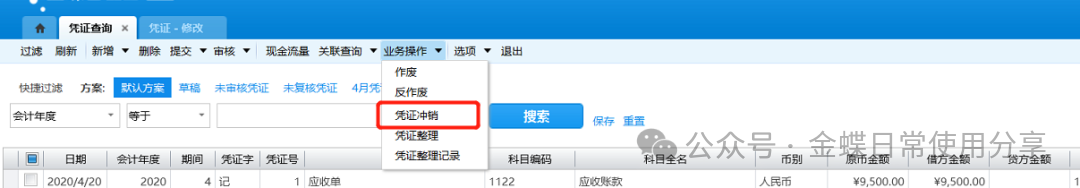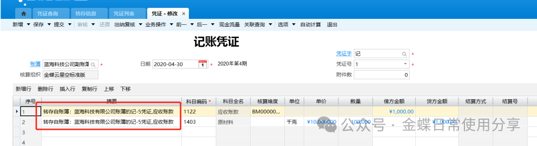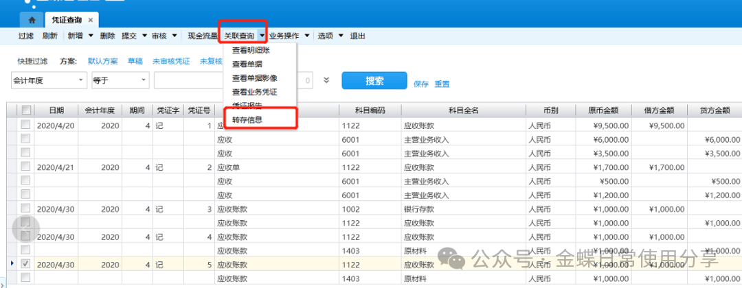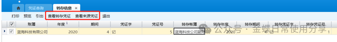 转存成功后,可选择该凭证在关联查询中选择“转存信息”查看转存的凭证以及来源凭证;