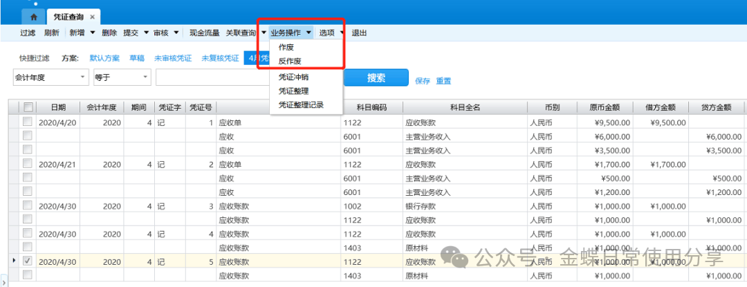 3.凭证只能在可修改状态下进行作废操作,由业务系统生成的凭证不允许作废(包括总账期末调汇、结转损益等操作生成的凭证);已作废的凭证不参与会计的记账,有作废标识,允许删除;但作废的凭证不允许修改、审核、出纳复核和过账;可对已作废凭证反作废,凭证即可恢复为正常状态;